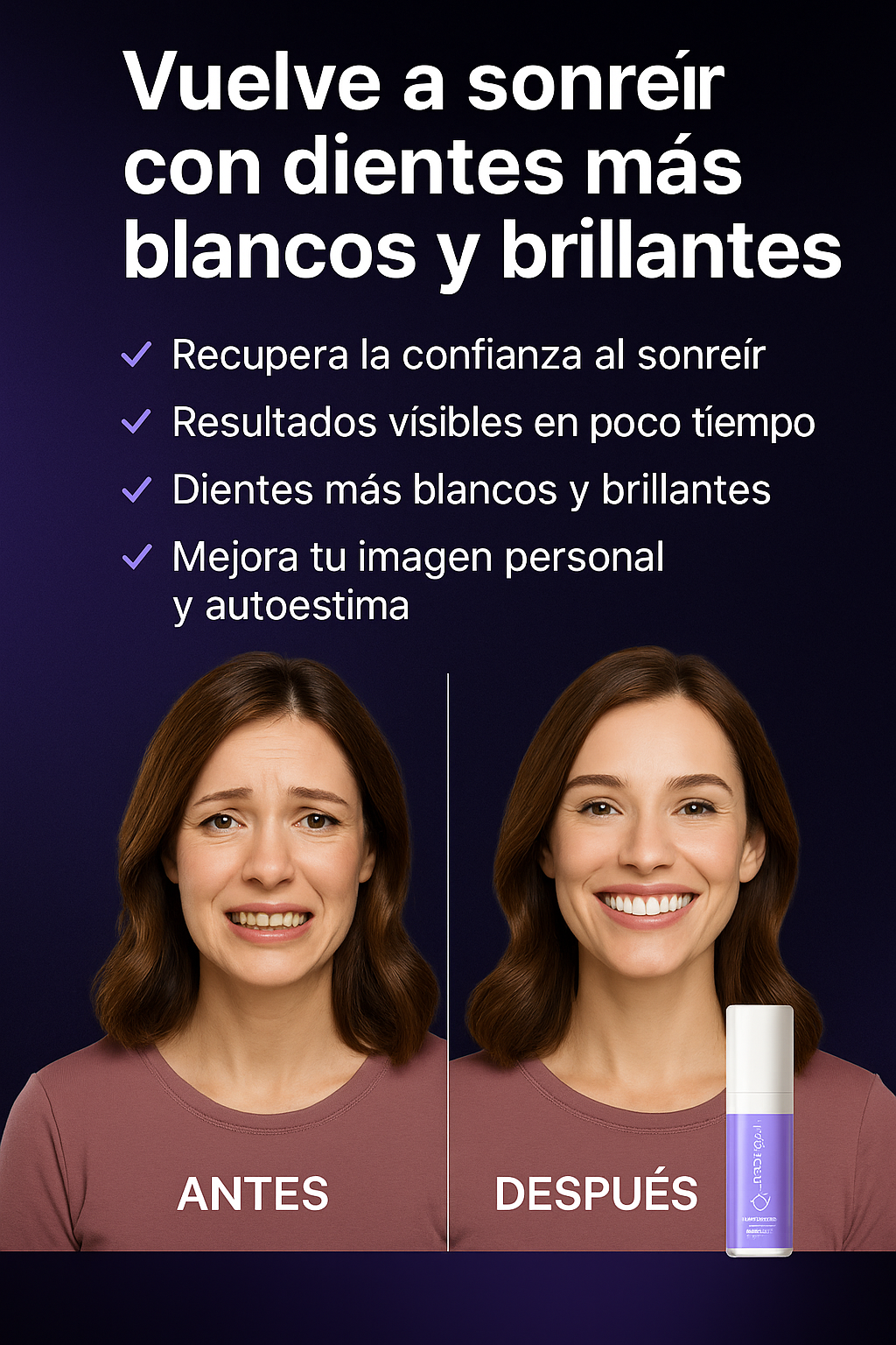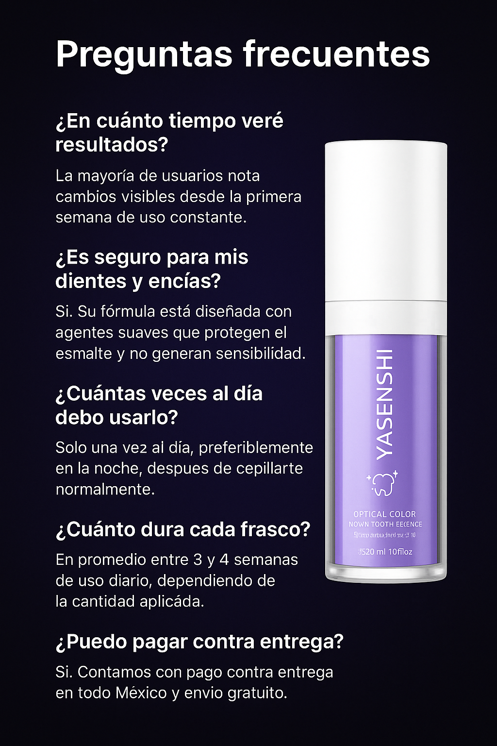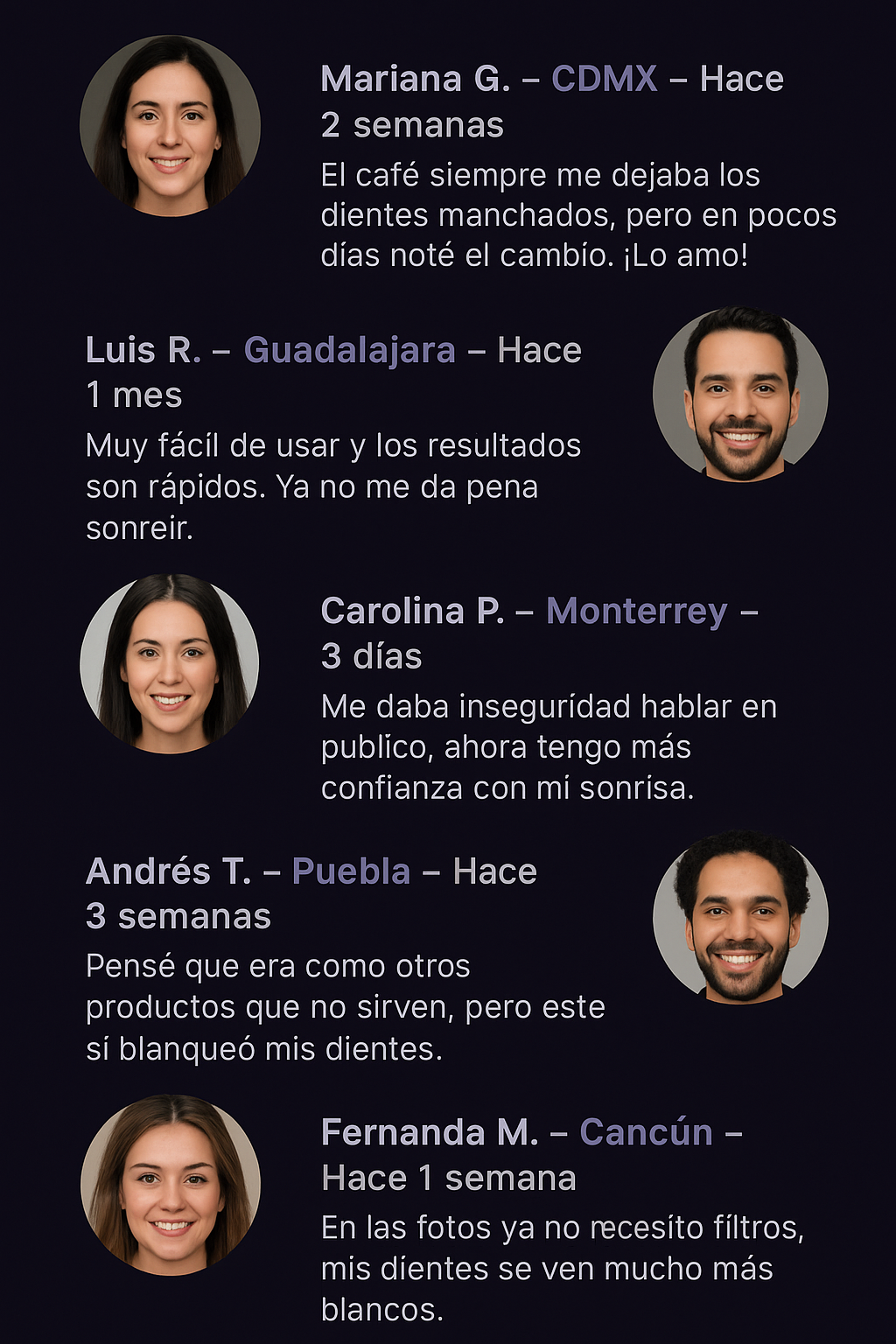 Mariana G. — CDMX — Hace 2 semanas ★★★★★ Siempre tuve los dientes amarillos por el café, pero con este producto noté la diferencia en pocos días. ¡Ahora sonrío sin pena!